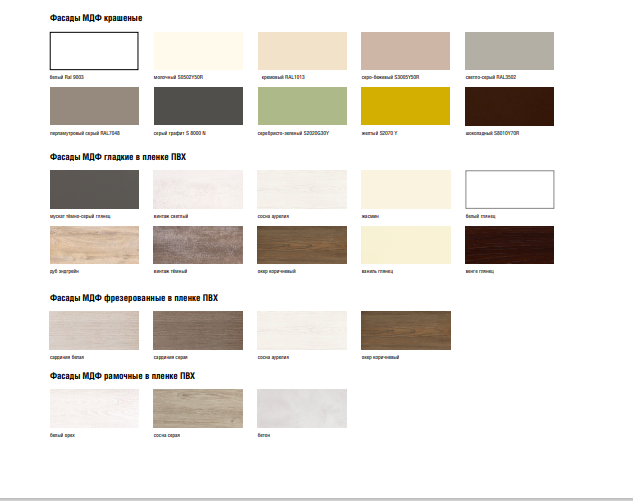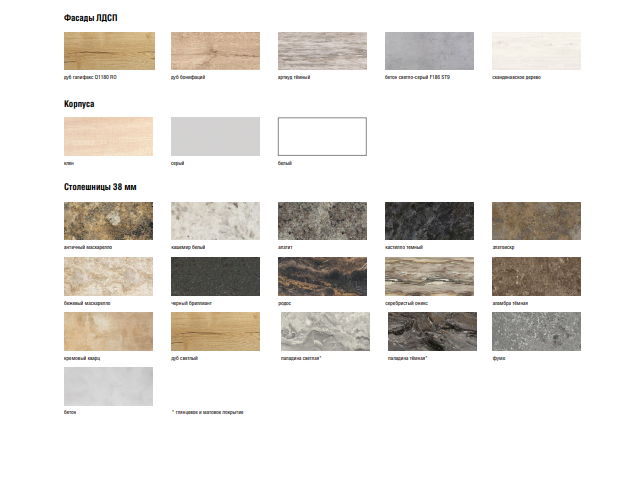 - Фурнитура: регулируемые опоры (пр-во Италия), ручки, петли – на выбор (пр-во Италия, Германия, Россия, Турция).