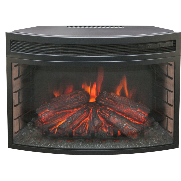 Электрический очаг для встраивания в обрамления под широкий очаг 25'. Полукруглое (панорамное) фронтальное стекло. Пятиступенчатая регулировка яркости огня. Шесть режимов работы полуторакиловаттного инфракрасного обогревателя. Модель оснащена пультом дистанционного управления. Встроен таймер выключения электрокамина.