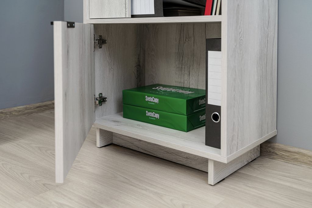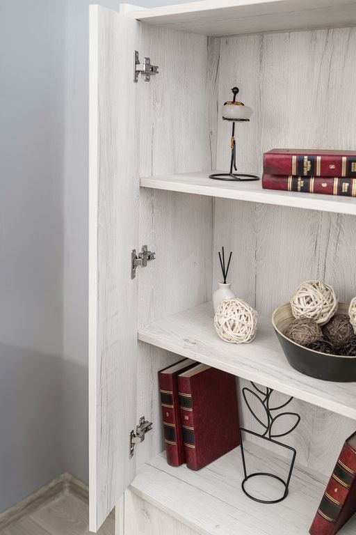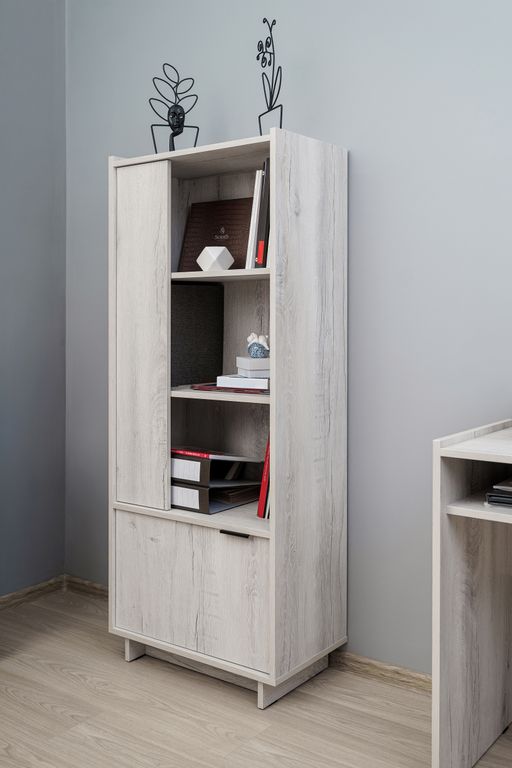 Открытый стеллаж с распашным фасадом и отделением с полками ФЛЕКС 25 в светлом цвете Дуб Шавиниган выполнен из ЛДСП класса эмиссии Е1 толщиной 16 мм. Такая открытая этажерка дополнит систему хранения в любой комнате: в гостиной, спальне, молодежной и прихожей. Бортики вверху по краям в одном стиле с коллекцией Флекс. Предусмотрена правосторонняя и левосторонняя сборка модуля.