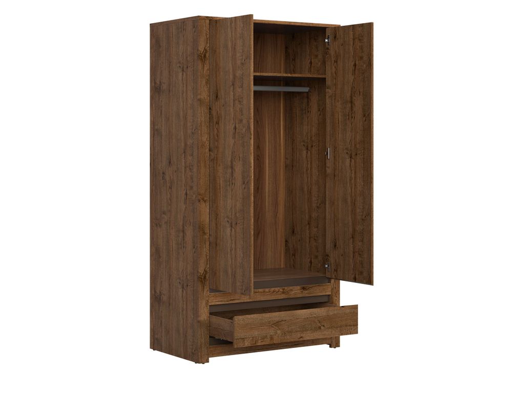 - За распашными дверьми расположено отделение с полкой и отделение с металлической штангой для одежды;