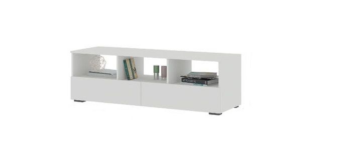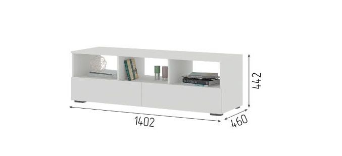 Тумба под ТВ имеет открытые три полки и два выкатных ящика. В сочетании с комодами и пеналами дает возможность создать неповторимые комплекты интерьера.