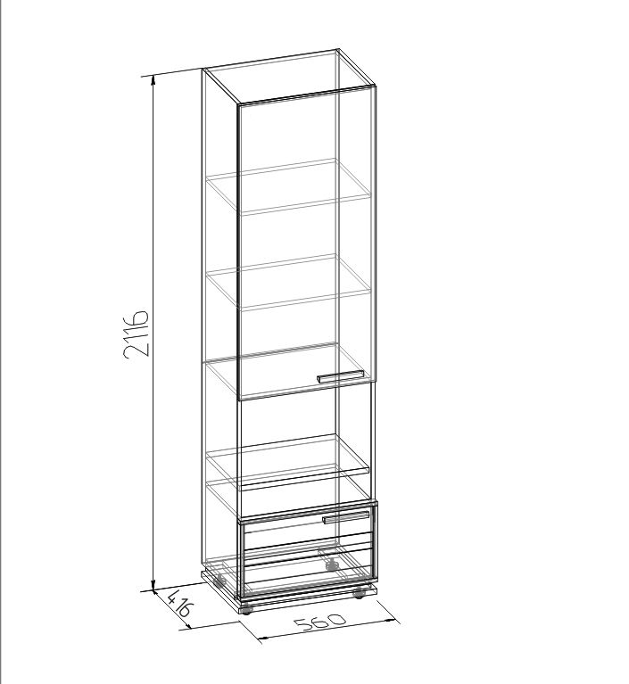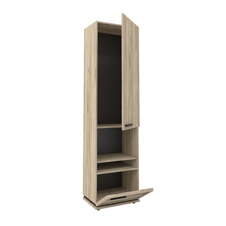 Компактность высокого шкафа МЦН сочетается с вместительностью, что идеально подходит даже для небольших гостиных. Это удобный и многофункциональный тип мебели для хранения. Его фасады перенавешиваются. На открытой полке можно разместить фотографии, книги или элементы декора, а за глухими фасадами спрятать личные вещи от посторонних глаз. Регулируемые опоры шкафа позволят компенсировать незначительные неровности пола. А двойной контрастный цоколь – интересная фишка.