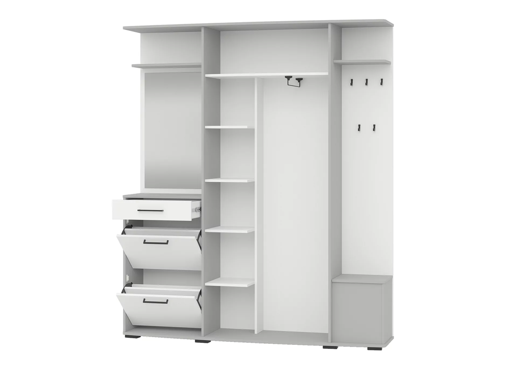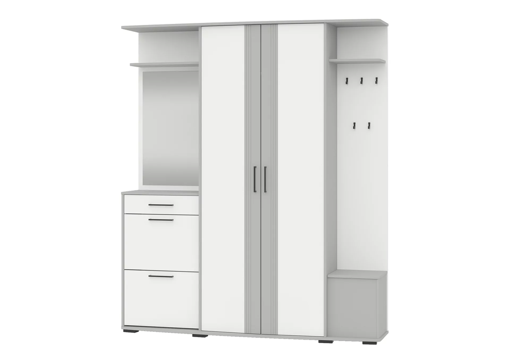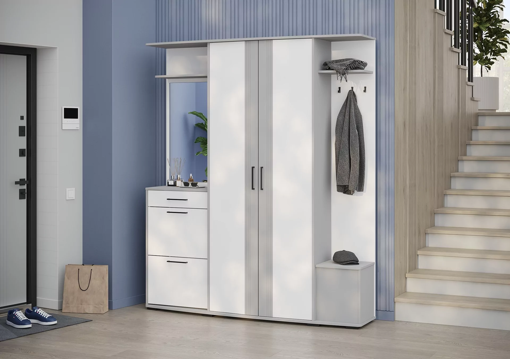 Состоит из нескольких элементов, которые необходимы в любой прихожей: шкаф для одежды, вешалка, зеркало и тумба для обуви.