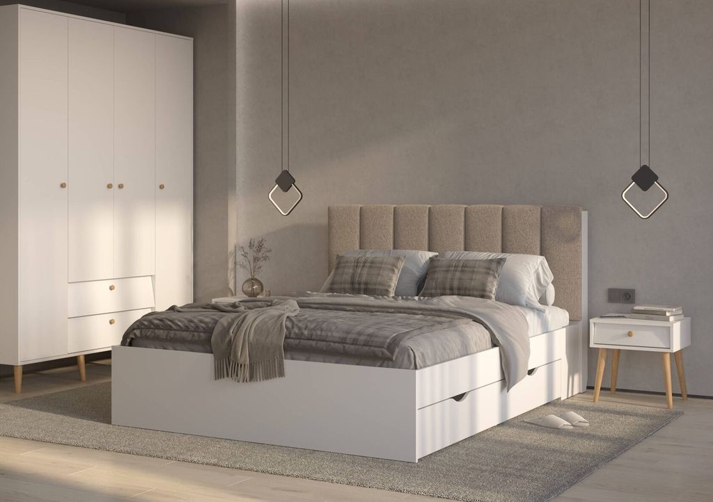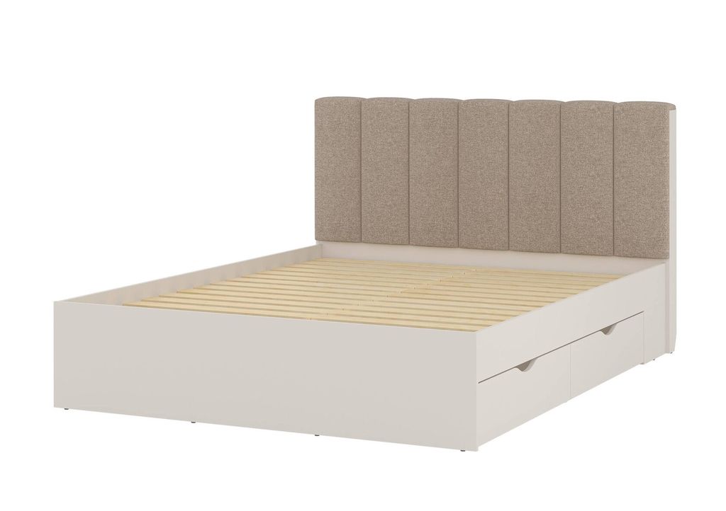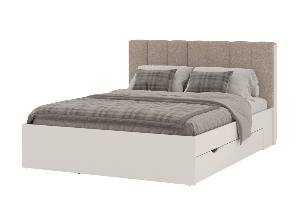 Элегантная кровать с мягким изголовьем и четырьмя ящиками.