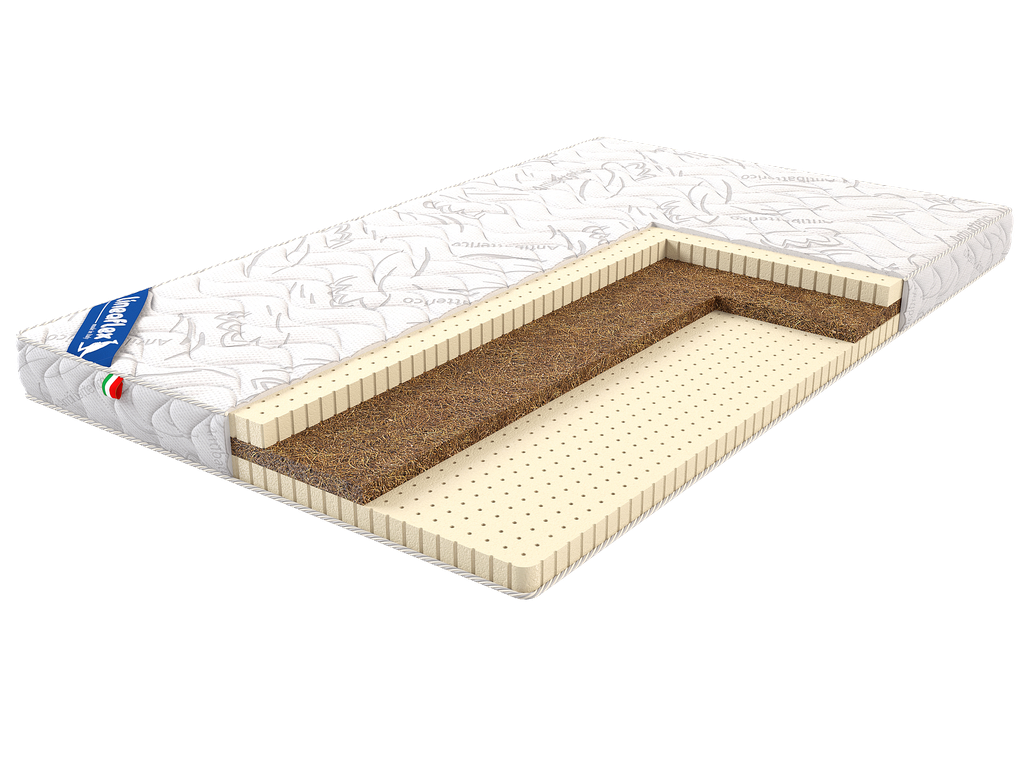 Латексированная кокосовая койра. Высокое содержание латекса (50%) обеспечивает материалу упругость и устойчивость к нагрузкам. Экологичность, природная эластичность и хорошая воздухопроницаемость плит из кокосового волокна делают поверхность матраса жёсткой и упругой. Обладает уникальным сочетанием свойств: прочность, упругость, устойчивость к любой влажности, воздухопроницаемость, гипоалергенность.