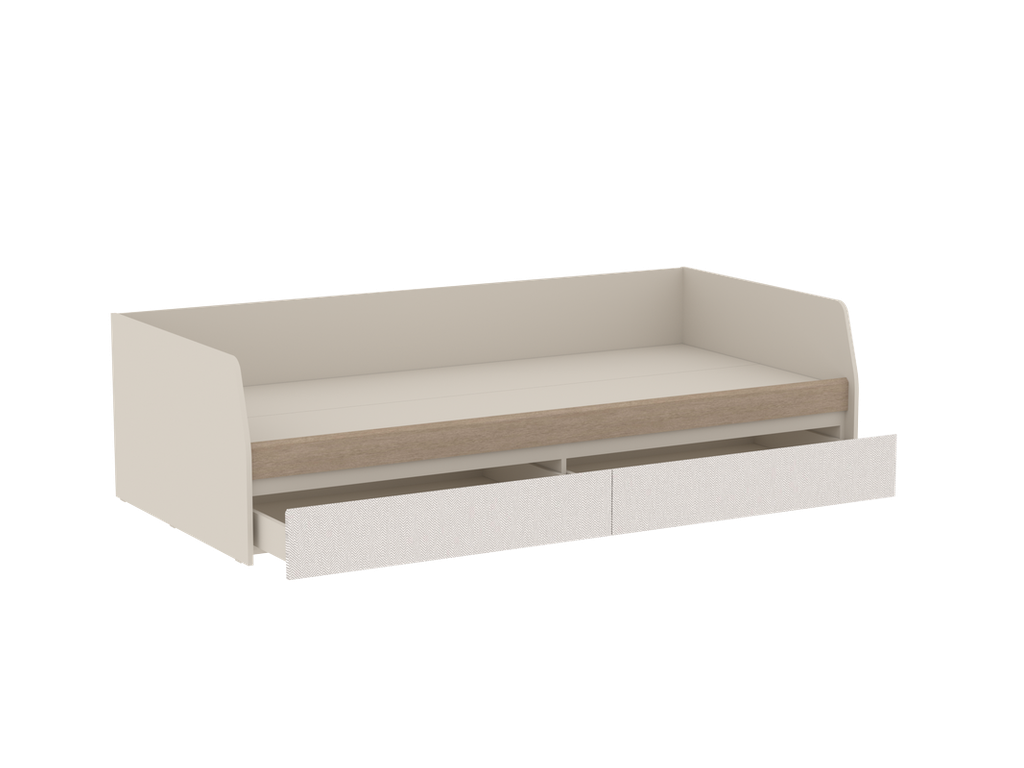 В кровати расположены два бельевых ящика на выкатных роликах.