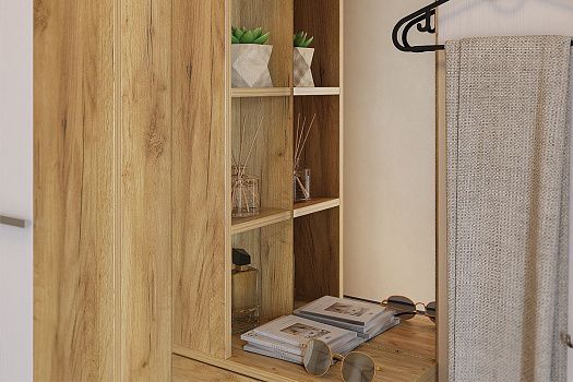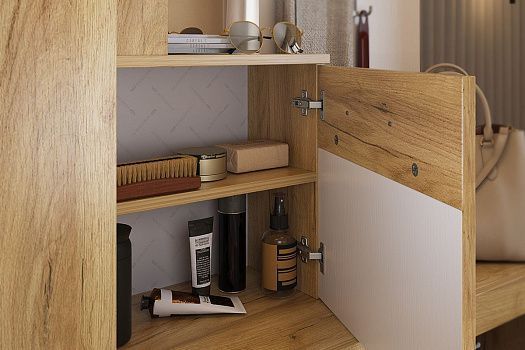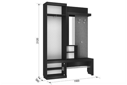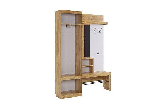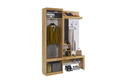 Состоит из: крючки для одежды, обувницы, открытой ниши для обуви, открытых полок, зеркала, полки для головных уборов, шкафа для одежды.
