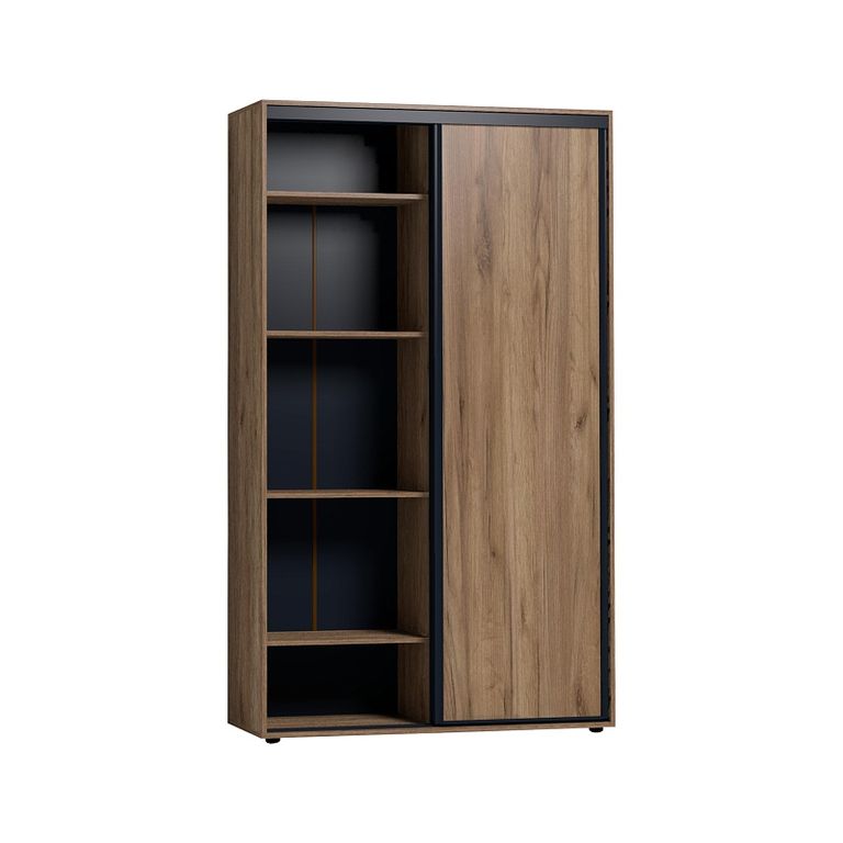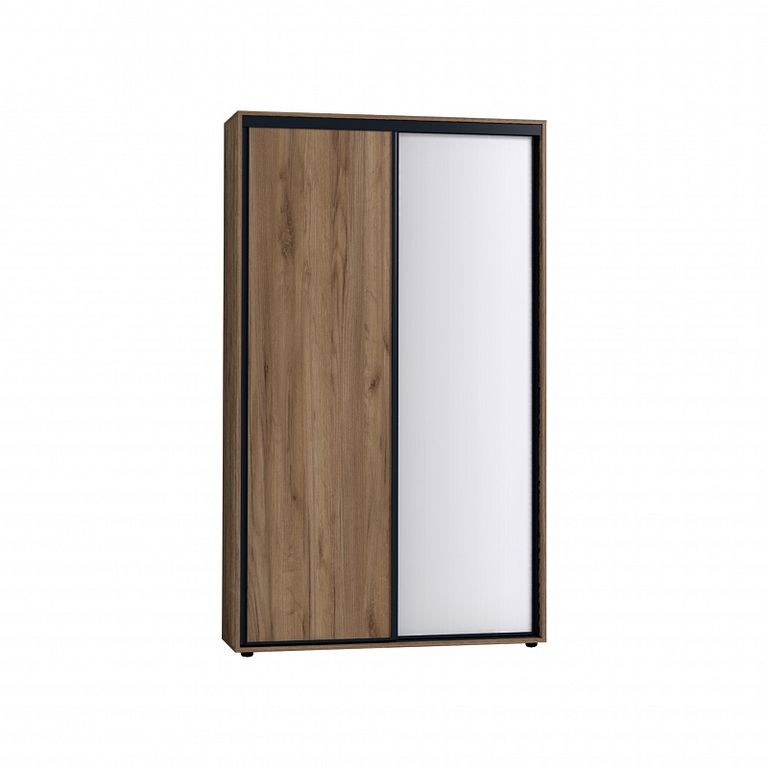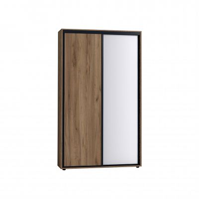 Два фасада, зеркальный и глухой в декоре Дуб Табачный, перемещаются на стальной системе Найди, которая обеспечивает легкость открывания, плавность и бесшумность хода. Зеркальный фасад проклеен с обратной стороны защитной пленкой. Регулируемые опоры компенсируют незначительные неровности пола.