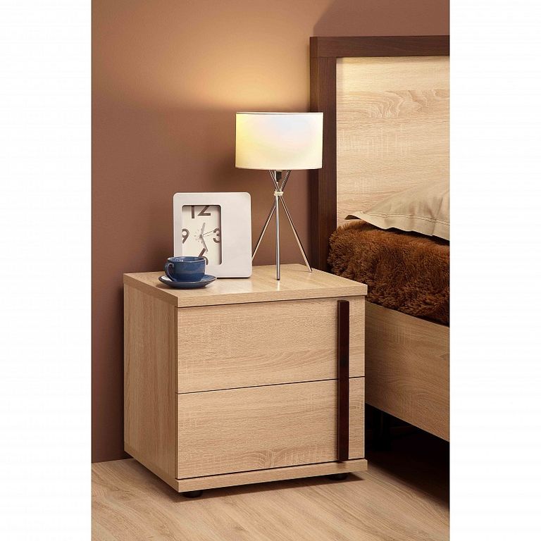 Лаконичный дизайн прикроватной тумбочки состоит из деревесного декора Дуб Сонома и контрастных ручек из крашеного дерева.