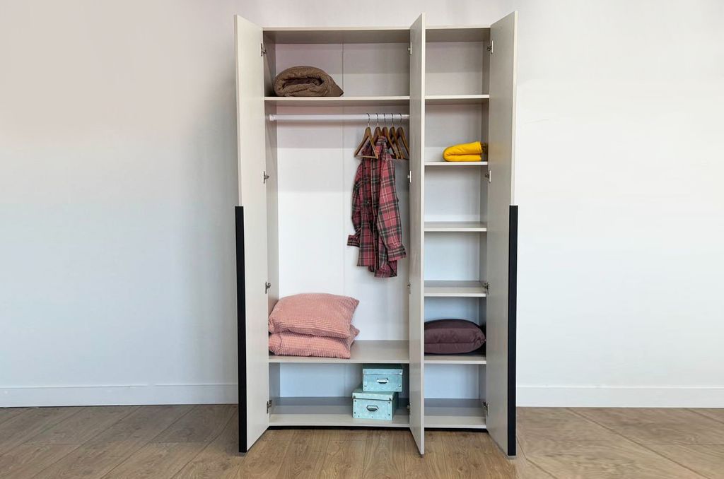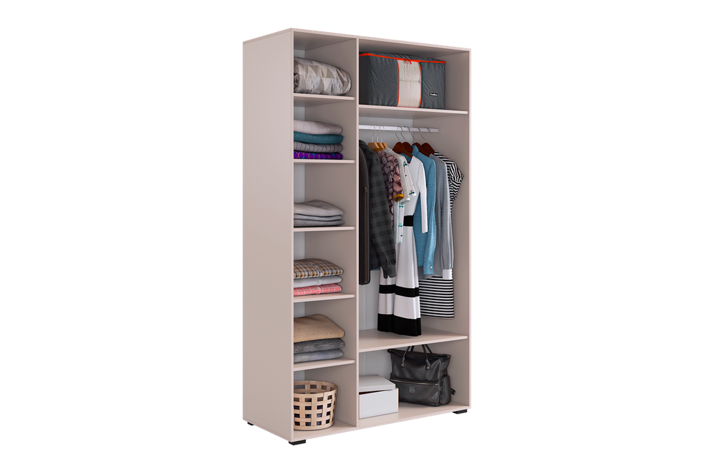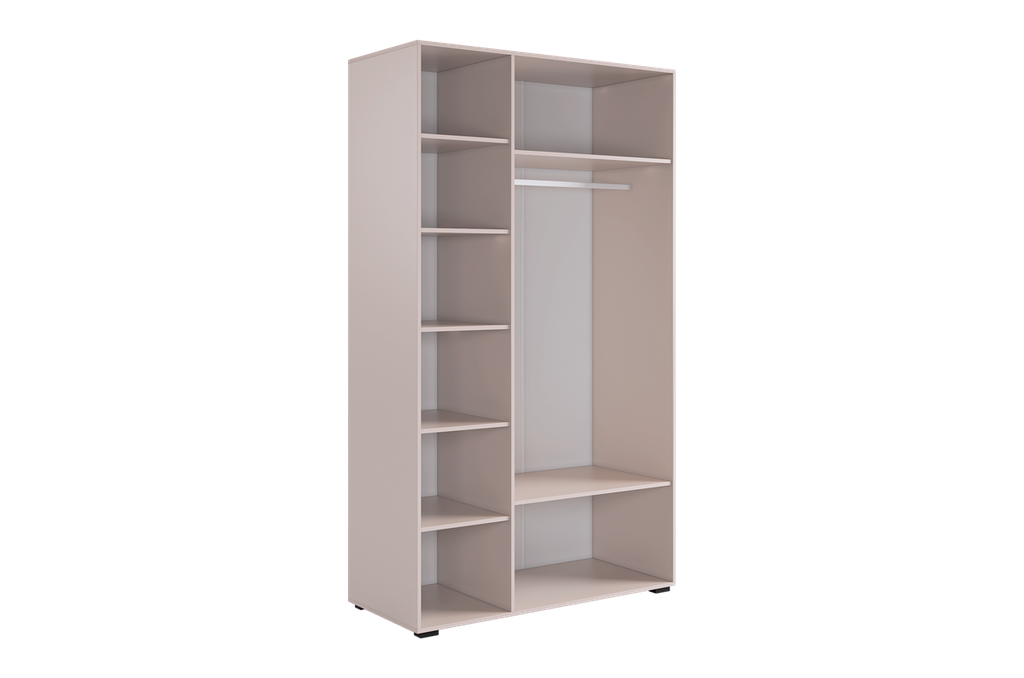 Шкаф имеет удобное наполнение: слева расположены полки для хранения вещей, а справа - штанга для вешалок. Это позволяет рационально использовать пространство и разместить различные типы одежды.