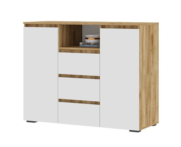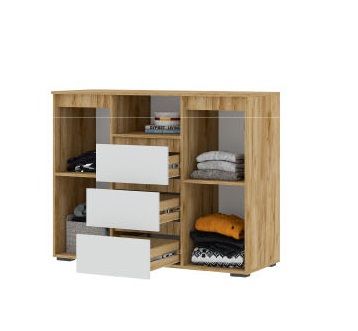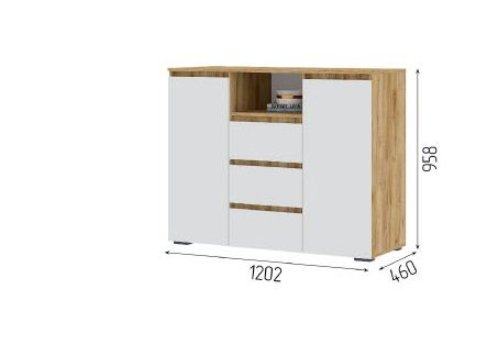 Комод совместил в себе две закрытые тумбы, три ящика и открытую полку.