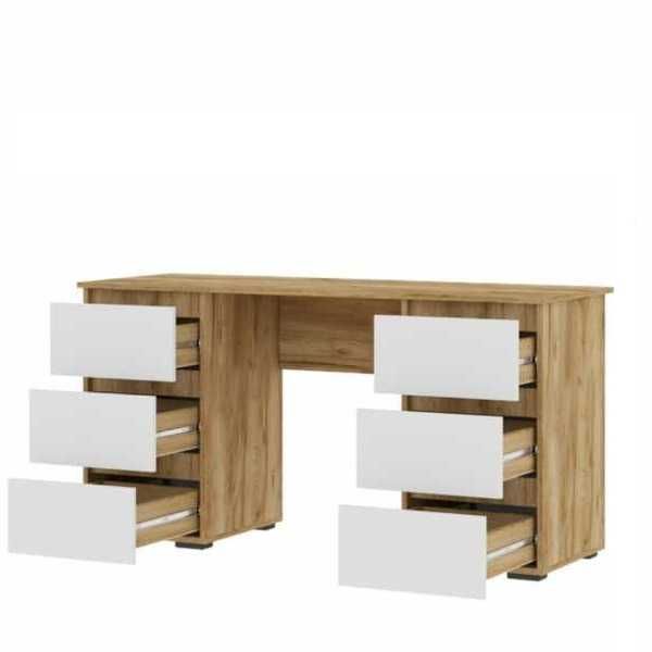 Письменный стол совмещает в себе рабочую поверхность с двумя тумбами, оснащенными тремя ящиками.