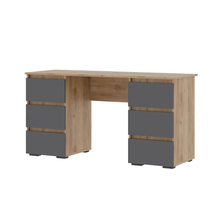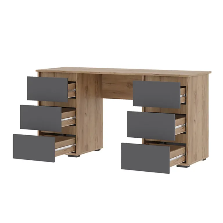 Письменный стол совмещает в себе рабочую поверхность с двумя тумбами, оснащенными тремя ящиками.