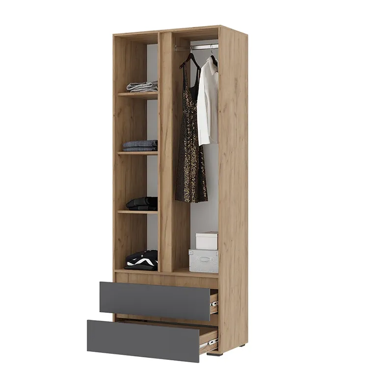 Шкаф с двумя распашными створками, укомлектованный тремя полками и штангой для одежды, имеет в нижней части два выкатных ящика полного выдвижения.