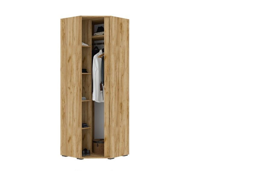 Угловой шкаф обеспечивает вместительное хранение вещей благодаря четырем глубоким полкам и большой секции с хромированной штангой для одежды на вешалках.