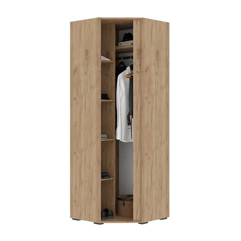Угловой шкаф обеспечивает вместительное хранение вещей благодаря четырем глубоким полкам и большой секции с хромированной штангой для одежды на вешалках.