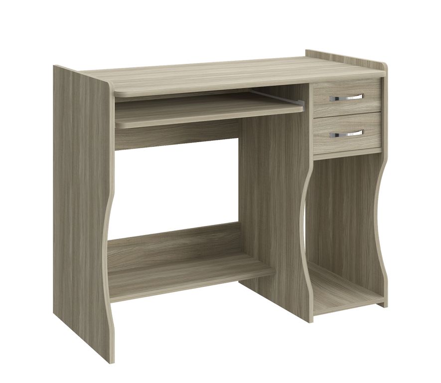 Имеются два ящика, выдвигающаяся полка для клавиатуры, место для системного блока и полка для папок внизу стола.