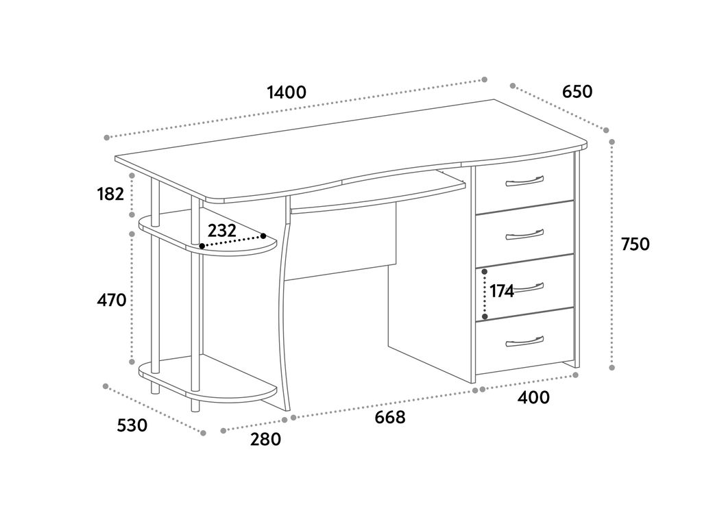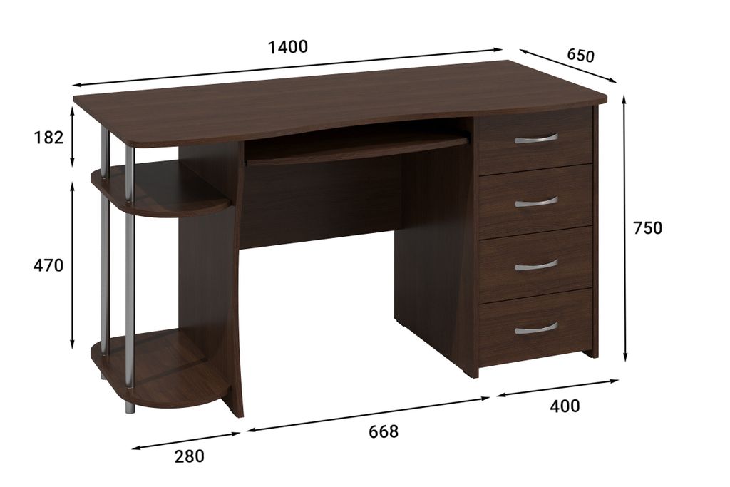 Компьютерный стол С-222БН предусматривает место для монитора, имеются четыре ящика, выдвигающаяся полка для клавиатуры и место для системного блока.