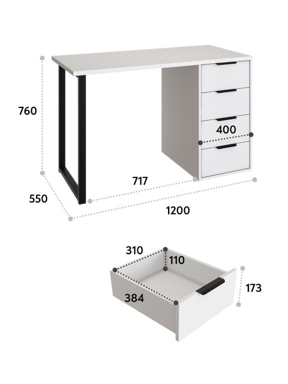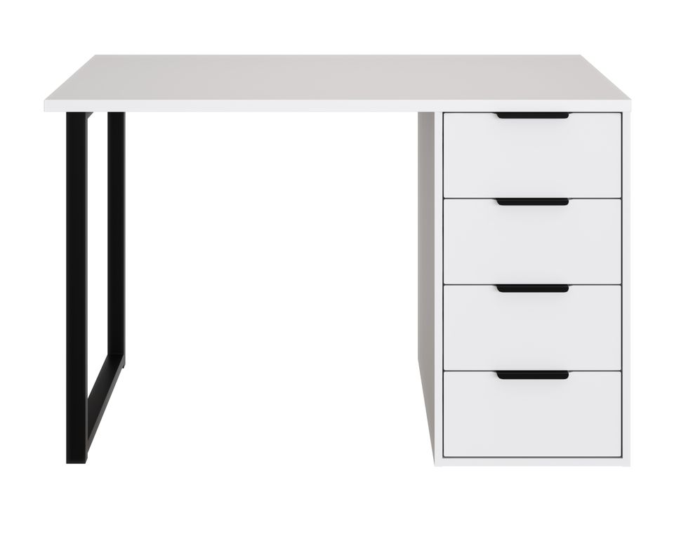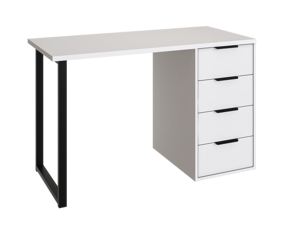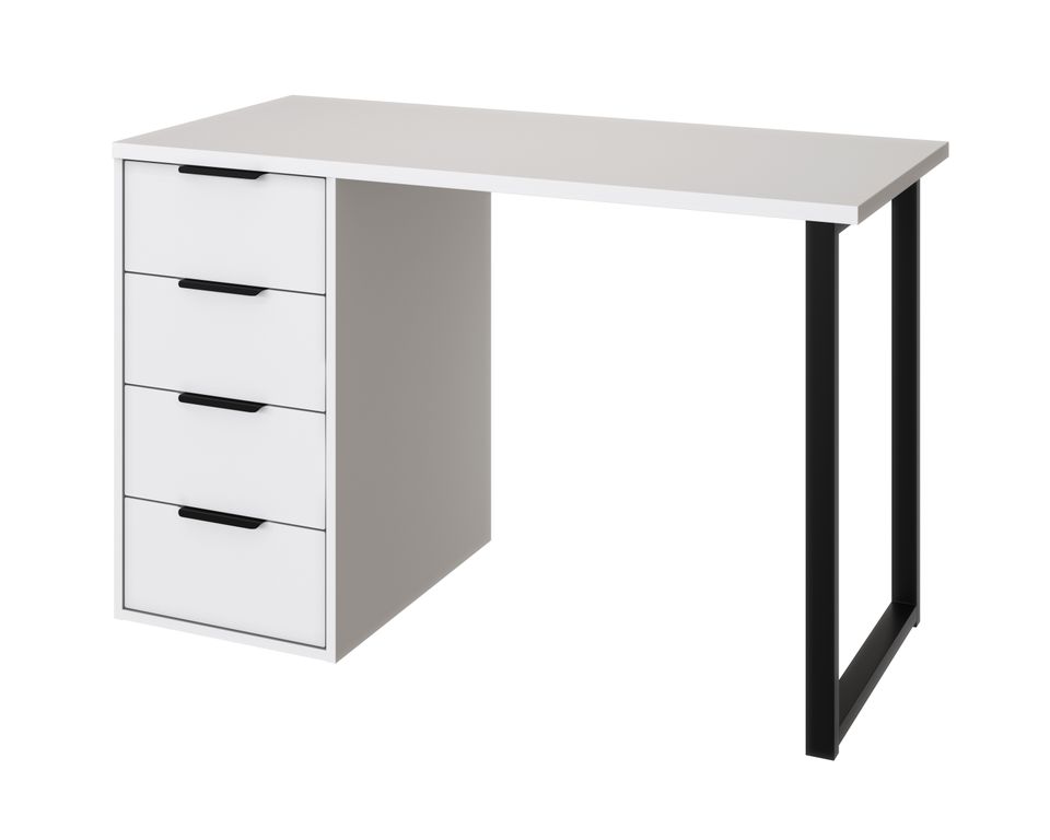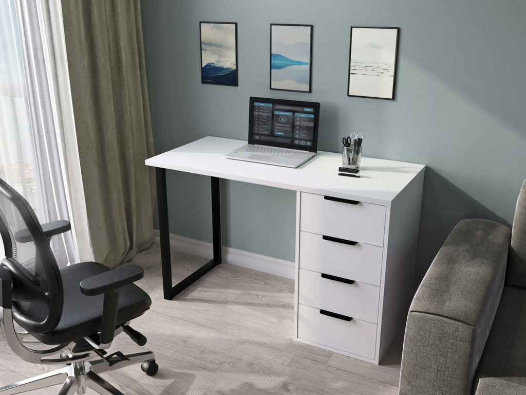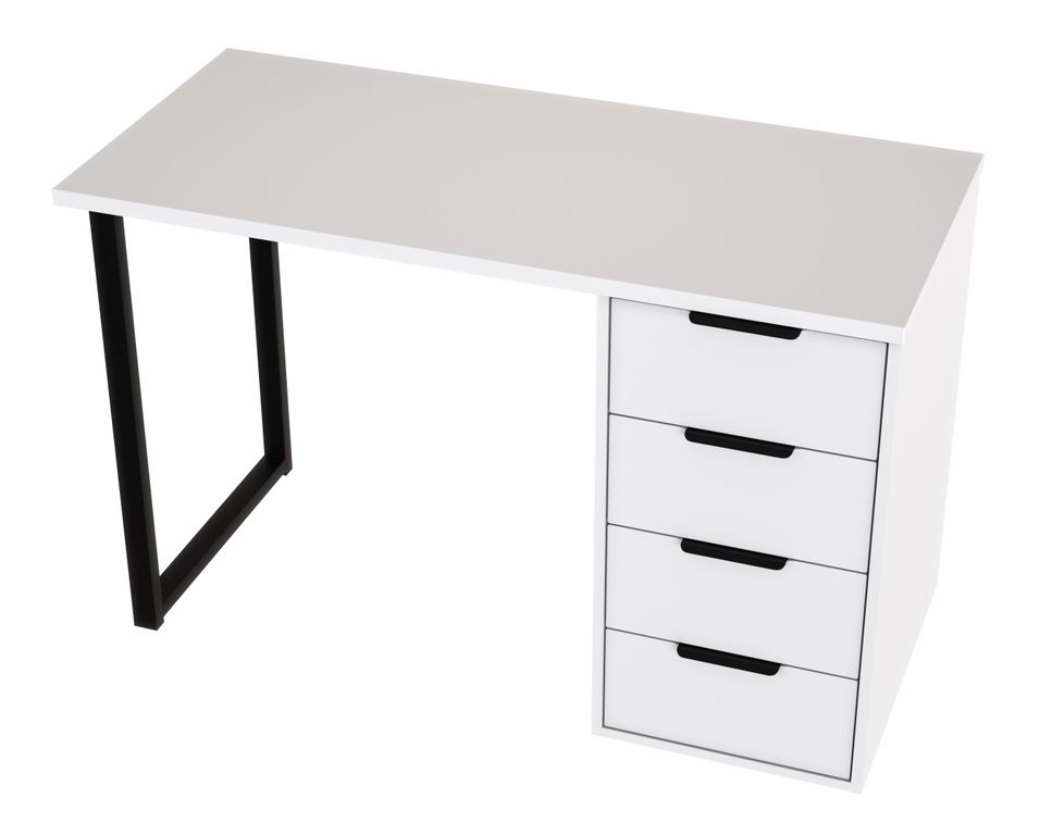 Стол имеет прочную стальную опору и тумбу с четырьмя выдвижными ящиками. Столешница изготовлена из ЛДСП 25 мм, фасады МДФ 16 мм. Дно ящика двп 3 мм.