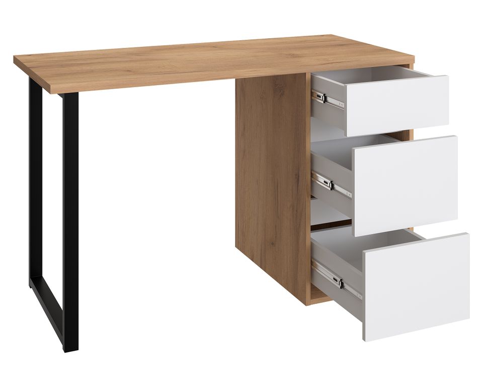 Стол имеет прочную стальную опору и тумбу с тремя выдвижными ящиками. Столешница изготовлена из ЛДСП 25 мм